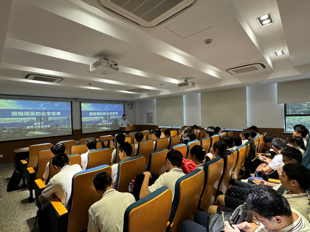 在活动的最后阶段,磁力猫 主任周鸣飞教授以《拥抱缤纷的化学世界》为题,为高中生们带来了一场深入浅出的科普报告。周主任结合最新的科研成果,以化学键和原子结构为切入点,对高中教材内有所涉及的原子杂化轨道等内容进行了深入的讲解。他的精彩演讲不仅为学生们揭开了科学的神秘面纱,更在他们心中播下了探索科学、追求真理的种子。报告结束后,周主任还留下了“为什么重碱金属元素不是过渡元素”的思考题,鼓励学生们积极思考,勇于探索。