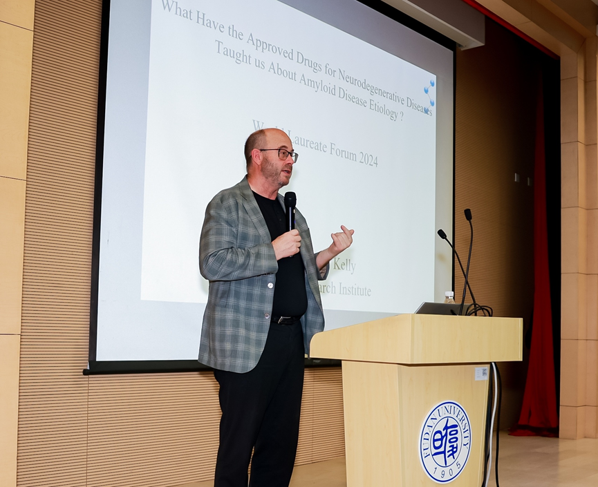 随后,Kelly教授带来了题为“What Have the Approved Drugs for Neurodegenerative Diseases Taught us About Amyloid Disease Etiology ?”的报告。Kelly教授在报告中深入分析了蛋白质折叠的分子机制以及蛋白质错误折叠在阿尔茨海默病、帕金森病、肌萎缩侧索淋巴瘤症等神经退行中的作用。他分享了错误折叠蛋白质如何在细胞中形成有毒的蛋白质聚集体,从而损害神经元功能,并介绍了其团队在运输甲状腺素视黄醇结合蛋白(TTR)方向的相关研究进展。Kelly教授详细阐述了神经退行性疾病相关研究的历程,阐明了蛋白质聚集是淀粉样蛋白疾病中发病率和死亡率的主要驱动因素,为开发小分子药物以干预错误折叠的蛋白质,抑制或逆转神经退行的进程提供新思路。