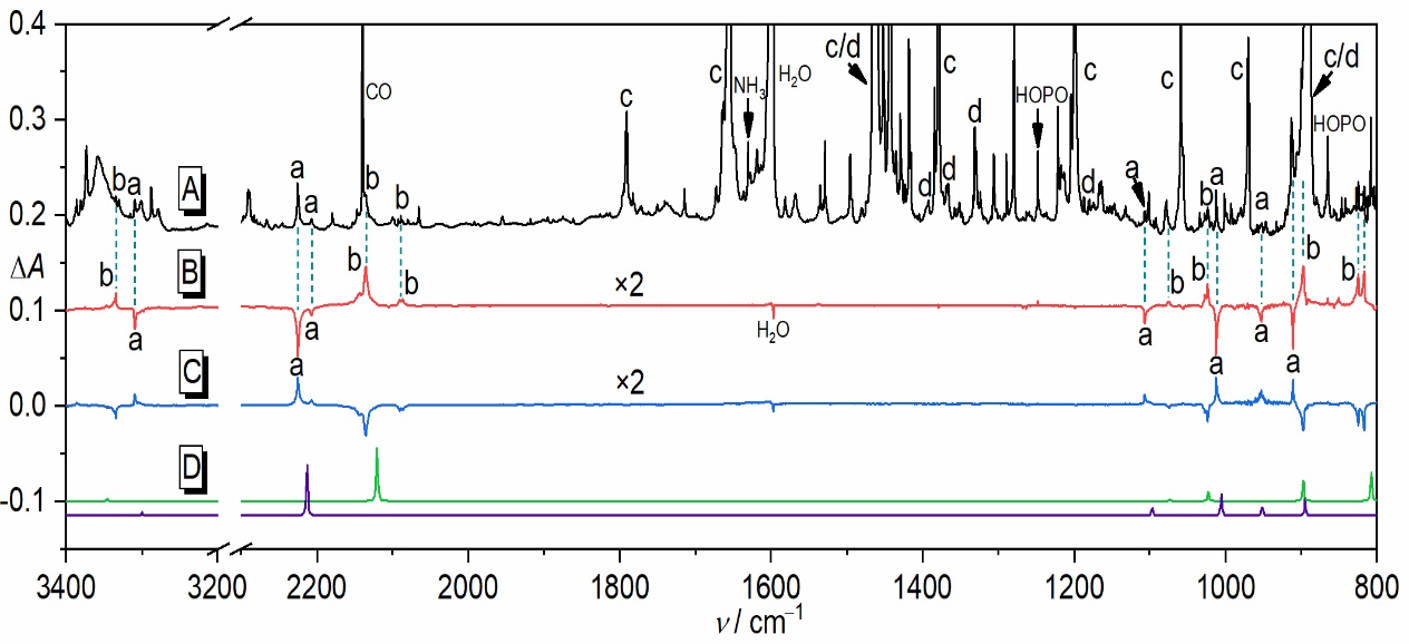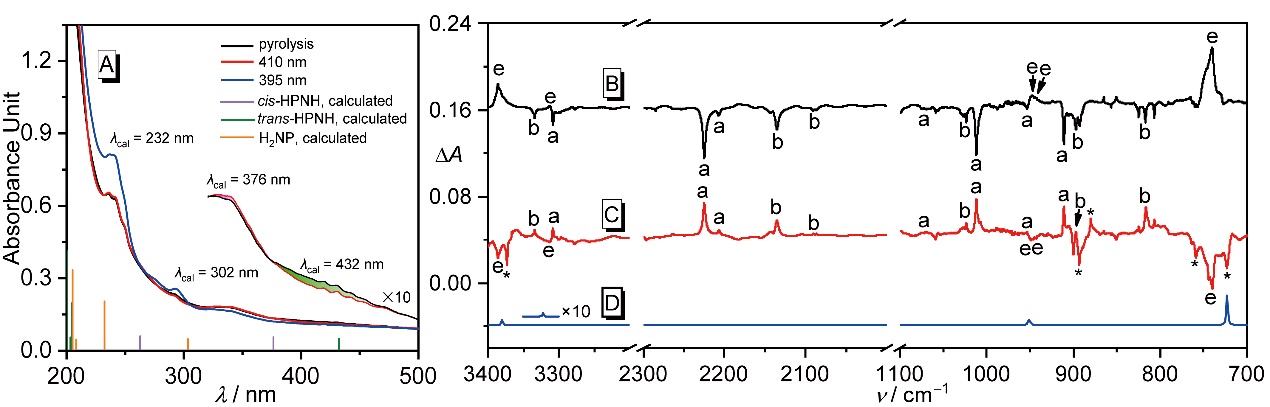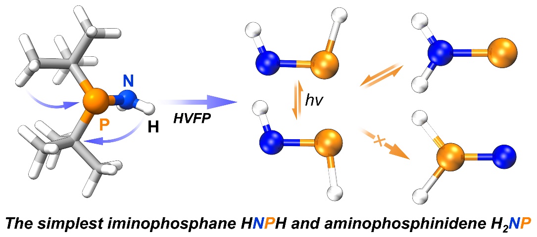近期,磁力猫 曾小庆教授、王丽娜副研究员团队通过自主研制的高真空闪光热解HVFP装置,以二叔丁基磷胺为前体,气相高温热解(~950 K)成功制备了HPNH。结合基质隔离红外和紫外可见吸收光谱表征、同位素标记实验和高精度理论计算,证实HPNH存在顺、反两种构象异构体,首次获得其指纹光谱数据。进一步通过选择性光激发,诱导两种构象之间的可逆转化。