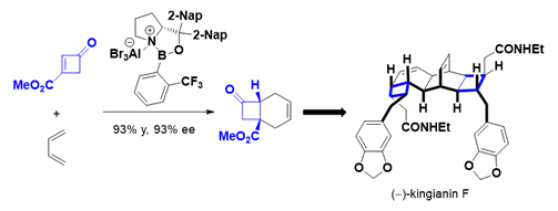 Cyclobutenone has been used as a highly reactive dienophile in Diels-Alder reactions, however, no enantioselective example has been reported. We disclose herein a chiral oxazaborolidine-aluminum bromide catalyzed enantioselective Diels-Alder reaction of 3-alkoxycarbonyl cyclobutenone with a variety of dienes. Furthermore, a total synthesis of (-)-kingianin F was completed for the first time via enantioenriched cycloadduct bicyclo[4.2.0]octane derivative.