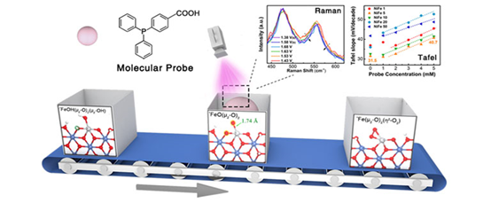 NiFe oxyhydroxide is one of the most promising oxygen evolution reaction (OER) catalysts for renewable hydrogen production, and deciphering the identity and reactivity of the oxygen intermediates on its surface is a key challenge but is critical to the catalyst design for improving the energy efficiency. Here, we screened and utilized in situ reactive probes that can selectively target specific oxygen intermediates with high rates to investigate the OER intermediates and pathway on NiFe oxyhydroxide. Most importantly, the oxygen atom transfer (OAT) probes (e.g. 4-(Diphenylphosphino) benzoic acid) could efficiently inhibit the OER kinetics by scavenging the OER intermediates, exhibiting lower OER currents, larger Tafel slopes and larger kinetic isotope effect (KIE) values, while probes with other reactivities demonstrated much smaller effects. Combining the OAT reactivity with electrochemical kinetic and operando Raman spectroscopic techniques, we identified a resting Fe=O intermediate in the Ni-O scaffold and a rate-limiting O-O chemical coupling step between a Fe=O moiety and a vicinal bridging O. DFT calculation further revealed a longer Fe=O bond formed on the surface and a large kinetic energy barrier of the O-O chemical step, corroborating the experimental results. These results point to a new direction of liberating lattice O and expediting O−O coupling for optimizing NiFe-based OER electrocatalyst.