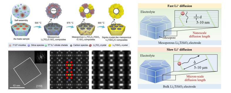 Due to their uncontrollable assembly and crystallization process, the synthesis of mesoporous metal oxide single crystals remains a formidable challenge. Herein, we report the synthesis of single-crystal-like mesoporous Li2TiSiO5 by using soft micelles as templates. The key lies in the atomic-scale self-assembly and step-crystallization processes, which ensure the formation of single-crystal-like mesoporous Li2TiSiO5 microparticles via an oriented attachment growth mechanism under the confinement of an in-situ formed carbon matrix. The mesoporous Li2TiSiO5 anode achieves a superior rate capability (148 mAh g−1 at 5.0 A g−1) and outstanding long-term cycling stability (138 mAh g−1 after 3000 cycles at 2.0 A g−1) for lithium storage as a result of the ultrafast Li+ diffusion caused by penetrating mesochannels and nanosized crystal frameworks (5–10 nm). In comparison, bulk Li2TiSiO5 exhibits poor rate capability and cycle performance due to micron-scale diffusion lengths. This method is very simple and reproducible, heralding a new way of designing and synthesizing mesoporous single crystals with controllable frameworks and chemical functionalities.