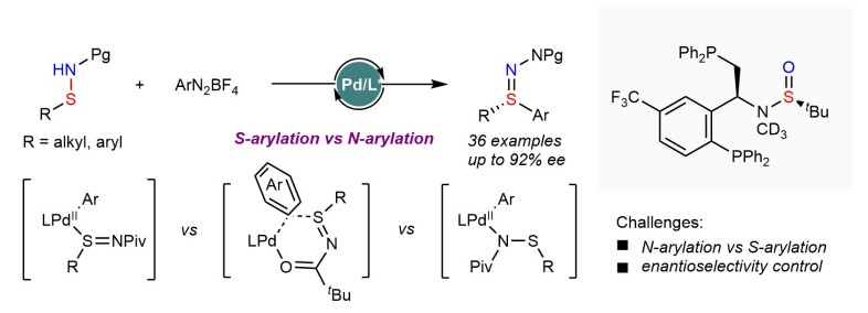 Sulfur-containing functional groups have garnered considerable attention owing to their frequent occurrence in ligands, pharmaceuticals and insecticides. However, enantioselective synthesis of sulfilimines, particularly diaryl sulfilimines remains a challenging and long-standing goal. Herein we report a highly enantio- and chemoselective cross-coupling of sulfenamides with aryl electrophiles to construct diverse S(IV) stereocenters by Pd catalysis. Bisphosphine ligands bearing sulfinamide groups were crucial for attaining high reactivity and selectivity. This strategy offers a general, modular and divergent platform for rapid synthesis of chiral sulfilimines and sulfoximines that are otherwise difficult to access. Furthermore, the origins of the high chemoselectivity and enantioselectivity were extensively investigated using density functional theory calculations.
