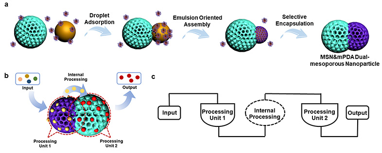 The ability of Janus nanoparticles to establish biological logic systems has been widely exploited, yet conventional non/uni-porous Janus nanoparticles are unable to fully mimic biological communications. Here we demonstrate an emulsion-oriented assembly approach for the fabrication of highly uniform Janus double-spherical MSN&mPDA (MSN, mesoporous silica nanoparticle; mPDA, mesoporous polydopamine) nanoparticles. The delicate Janus nanoparticle possesses a spherical MSN with a diameter of ~150 nm and an mPDA hemisphere with a diameter of ~120 nm. In addition, the mesopore size in the MSN compartment is tunable from ~3 to ~25 nm, while those in the mPDA compartments range from ~5 to ~50 nm. Due to the different chemical properties and mesopore sizes in the two compartments, we achieve selective loading of guests in different compartments, and successfully establish single-particle-level biological logic gates. The dual-mesoporous structure enables consecutive valve-opening and matter-releasing reactions within one single nanoparticle, facilitating the design of single-particle-level logic systems.