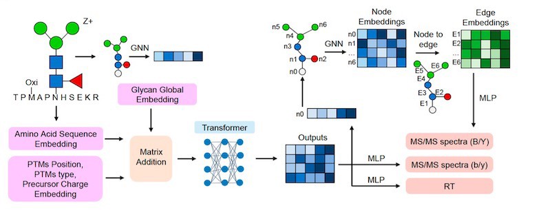 Protein glycosylation, a post-translational modification of proteins by glycans, plays an important role in numerous physiological and pathological cellular functions. Glycoproteomics, the study of protein glycosylation on a proteome-wide scale, utilizes liquid chromatography coupled with tandem mass spectrometry (MS/MS) to get combinational information on glycosylation site, glycosylation level and glycan structure. However, current database searching methods for glycoproteomics often struggle with glycan structure determination due to the limited occurrence of structure-determining ions. Although spectral searching methods can leverage fragment intensity to facilitate the structure identification of glycopeptides, their application is hindered by difficulties in spectral library construction. In this work, we present DeepGP, a hybrid deep learning framework based on transformer and graph neural networks, for the prediction of MS/MS spectra and retention time of glycopeptides. Two graph neural network modules are employed to capture the branched glycan structure and predict glycan ion intensity, respectively. Additionally, a pretraining strategy is implemented to alleviate the insufficiency of glycoproteomics data. Testing on multiple biological datasets, DeepGP accurately predicts MS/MS spectra and retention time of glycopeptides, closely aligning with the experimental results. Comprehensive benchmarking of DeepGP on synthetic and biological datasets validates its effectiveness in distinguishing similar glycans. Based on various decoy methods, DeepGP in combination with database searching can increase glycopeptide detection sensitivity. We anticipate that DeepGP can inspire extensive future work in glycoproteomics.