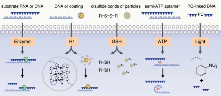 In this Account, we summarize our recent work in dynamic chemistry of DNA-based nanoassemblies in living cells from the perspective of stimulus types including enzyme, H+, glutathione (GSH), adenosine triphosphate (ATP), and light. Upon the specific stimuli, DNA-based nanoassemblies undergo precise assembly in living cells, executing disassembly or aggregation, which consequently affects the functions and behaviors of living cells. In the first part, we describe the interactions between DNA-based nanoassemblies and intracellular enzymes, namely the enzymatic cleavage of intracellular enzymes on the DNA or RNA sequences. In the second part, we summarize the effects of H+ in lysosomes on DNA-based nanoassemblies, including the formation of a tetraplex i-motif structure and the decomposition of acid-degradable polymeric coating. In the third part, we discuss the mechanism of GSH responsiveness of DNA-based nanoassemblies, including the breaking of disulfide bonds and reduction-responsive nanoparticles. In the fourth part, we describe the ATP-mediated conformational transition for the specific release of functional RNA sequences. In the fifth part, we demonstrate the light-mediated spatiotemporally dynamic chemistry of DNA-based nanoassemblies. In summary, based on the achievements of our group in the study of dynamic chemistry of DNA-based nanoassemblies, the assembly, disassembly, and reassembly in living cells are well-controlled, the regulation of cellular functions are explored, and the new strategies for cancer therapeutics are demonstrated. We envision that our work on the dynamic chemistry of DNA-based nanoassembly is a new paradigm for constructing dynamic material chemistry systems inside living cells, and will facilitate the development of precision medicine.