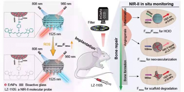 In situ monitoring of tissue regeneration progression is of primary importance to basic medical research and clinical transformation. Despite significant progress in the field of tissue engineering and regenerative medicine, few technologies have been established to in situ inspect the regenerative process. Here, we present an integrated second near-infrared (NIR-II, 1000–1700 nm) window in vivo imaging strategy based on 3D-printed bioactive glass scaffolds doped with NIR-II ratiometric lanthanide-dye hybrid nanoprobes, allowing for in situ monitoring of the early inflammation, angiogenesis, and implant degradation during mouse skull repair. The functional bioactive glass scaffolds contribute to more effective bone regeneration because of their excellent angiogenic and osteogenic activities. The reliability of ratiometric fluorescence imaging, coupled with low autofluoresence in the NIR-II window, facilitates the accuracy of in vivo inflammation detection and high-resolution visualization of neovascularization and implant degradation in deep tissue.