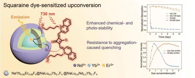 Upconversion nanoparticles (UCNPs) doped with lanthanides have limited brightness due to their small absorption cross section to light. However, using organic sensitizers can significantly enhance their light absorption ability. Unfortunately, the practical application of organic sensitizers has been hindered by poor stability and aggregation-caused quenching (ACQ). To address these issues, we developed a novel squaraine-based dye, SQ-739, for sensitizing upconversion luminescence (UCL). This dye has a maximum absorption at 739 nm, and shows 1 order of magnitude and 2-fold improved chemical- and photostability, compared to the commonly used cyanine-based dye IR-806, respectively. When SQ-739 is used to sensitize UCNPs, the resulting SQ-739-UCNPs exhibit excellent photostability and reduced ACQ in the presence of polar solvents. Moreover, at the single particle level, the SQ-739-UCNPs exhibit a 97-fold increase in UCL emission compared to bare UCNPs. This squaraine dye-based system represents a new design strategy for developing highly stable and efficient NIR upconversion probes.