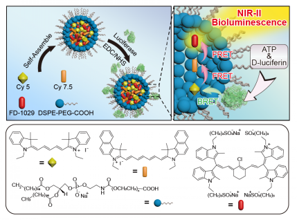 Bioluminescence imaging has been widely used in life sciences and biomedical applications. However, conventional bioluminescence imaging usually operates in the visible region, which hampers the high-performance in vivo optical imaging due to the strong tissue absorption and scattering. To address this challenge, here we present bioluminescence probes (BPs) with emission in the second near infrared (NIR-II) region at 1029 nm by employing bioluminescence resonance energy transfer (BRET) and two-step fluorescence resonance energy transfer (FRET) with a specially designed cyanine dye FD-1029. The biocompatible NIR-II-BPs are successfully applied to vessels and lymphatics imaging in mice, which gives ~5 times higher signal-to-noise ratios and ~1.5 times higher spatial resolution than those obtained by NIR-II fluorescence imaging and conventional bioluminescence imaging. Their capability of multiplexed imaging is also well displayed. Taking advantage of the ATP-responding character, the NIR-II-BPs are able to recognize tumor metastasis with a high tumor-to-normal tissue ratio at 83.4.