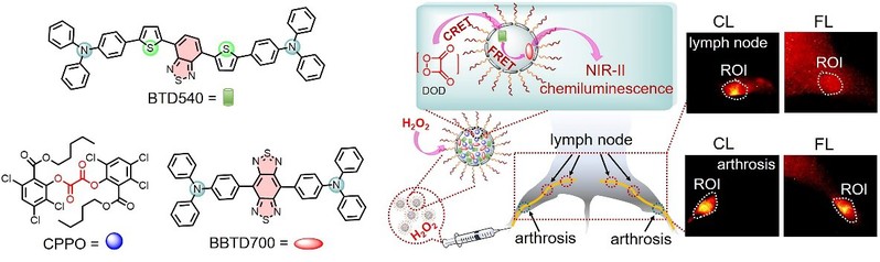 Chemiluminescence (CL) sensing without external excitation by light and autofluorescence interference has been applied to high‐contrast in vitro immunoassays and in vivo inflammation and tumor microenvironment detection. However, conventional CL sensing usually operates in the range of 400–850 nm, which limits the performance of in vivo imaging due to serious light scattering effects and signal attenuation in tissue. To address this challenge, a new type of CL sensor is presented that functions in the second near‐infrared window (NIR‐II CLS) with a deep penetration depth (≈8 mm). Successive CL resonance energy transfer (CRET) and Förster resonance energy transfer (FRET) from the activated CL substrate to two rationally designed donor‐acceptor‐donor fluorophores BTD540 and BBTD700 occurs. NIR‐II CLS can be selectively activated by hydrogen peroxide over other reactive oxygen species (ROSs). Moreover, NIR‐II CLS is capable of detecting local inflammation in mice with a 4.5‐fold higher signal‐to‐noise ratio (SNR) than that under the NIR‐II fluorescence modality.