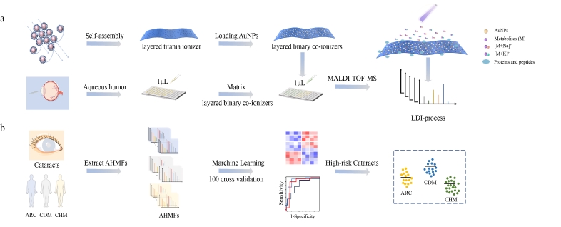 Diabetes and high myopia as well-known high-risk factors can aggravate cataracts, yet clinical coping strategy remains a bottleneck. Metabolic analysis tends to be powerful for precisely detection and mechanism exploration since most of diseases including cataracts are accompanied by metabolic disorder. Herein, a layered binary co-ionizers assisted aqueous humor metabolic analysis tool is proposed for potentially etiological typing and detection of cataracts, including age-related cataracts (ARC), cataracts with diabetes mellitus (CDM), and cataracts with high myopia (CHM). Startlingly, taking advantage of the optimal machine learning algorithm and all metabolic fingerprints, 100% of accuracy, precision, and recall rates are achieved for arbitrary comparison between groups. Moreover, 11, 9, and 7 key metabolites with explicit identities are confirmed as markers of discriminating CDM from ARC, CHM from ARC, and CDM from CHM, and the corresponding area under the curve values of validation cohorts are 0.985, 1.000, and 1.000. Finally, the critical impact of diabetes/high myopia on cataracts is revealed by excavating the change levels and metabolic pathways of key metabolites. This work updates the insights of prevention and treatment about cataracts at metabolic level and throws out huge surprises and progresses metabolic diagnosis toward a reality.