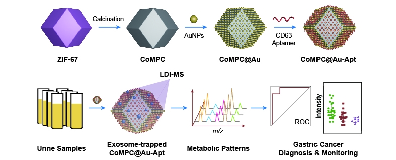 Gastric cancer (GC) presents high mortality worldwide because of delayed diagnosis. Currently, exosome-based liquid biopsy has been applied in diagnosis and monitoring of diseases including cancers, whereas disease detection based on exosomes at the metabolic level is rarely reported. Herein, the specific aptamer-coupled Au-decorated polymorphic carbon (CoMPC@Au-Apt) is constructed for the capture of urinary exosomes from early GC patients and healthy controls (HCs) and the subsequent exosome metabolic pattern profiling without extra elution process. Combining with machine learning algorithm on all exosome metabolic patterns, the early GC patients are excellently discriminated from HCs, with an accuracy of 100% for both the discovery set and blind test. Ulteriorly, three key metabolic features with clear identities are determined as a biomarker panel, obtaining a more than 90% diagnostic accuracy for early GC in the discovery set and validation set. Moreover, the change law of the key metabolic features along with GC development is revealed through making a comparison among HCs and GC at early stage and advanced stage, manifesting their monitoring ability toward GC. This work illustrates the high specificity of exosomes and the great prospective of exosome metabolic analysis in disease diagnosis and monitoring, which will promote exosome-driven precision medicine toward practical clinical application.